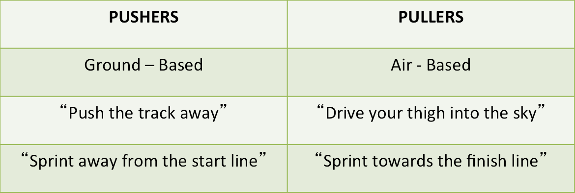 With an understanding of an athletes’ preferred movement type you will also gain direction on where to target your cueing. For instance, ground-based cues such as, “Push the track away” or “Run away from the starting blocks” will have a higher success rate with athletes under the Push category. Air-based cues such as “Drive your thigh up to the sky” will have a higher success rate with Pull athletes.